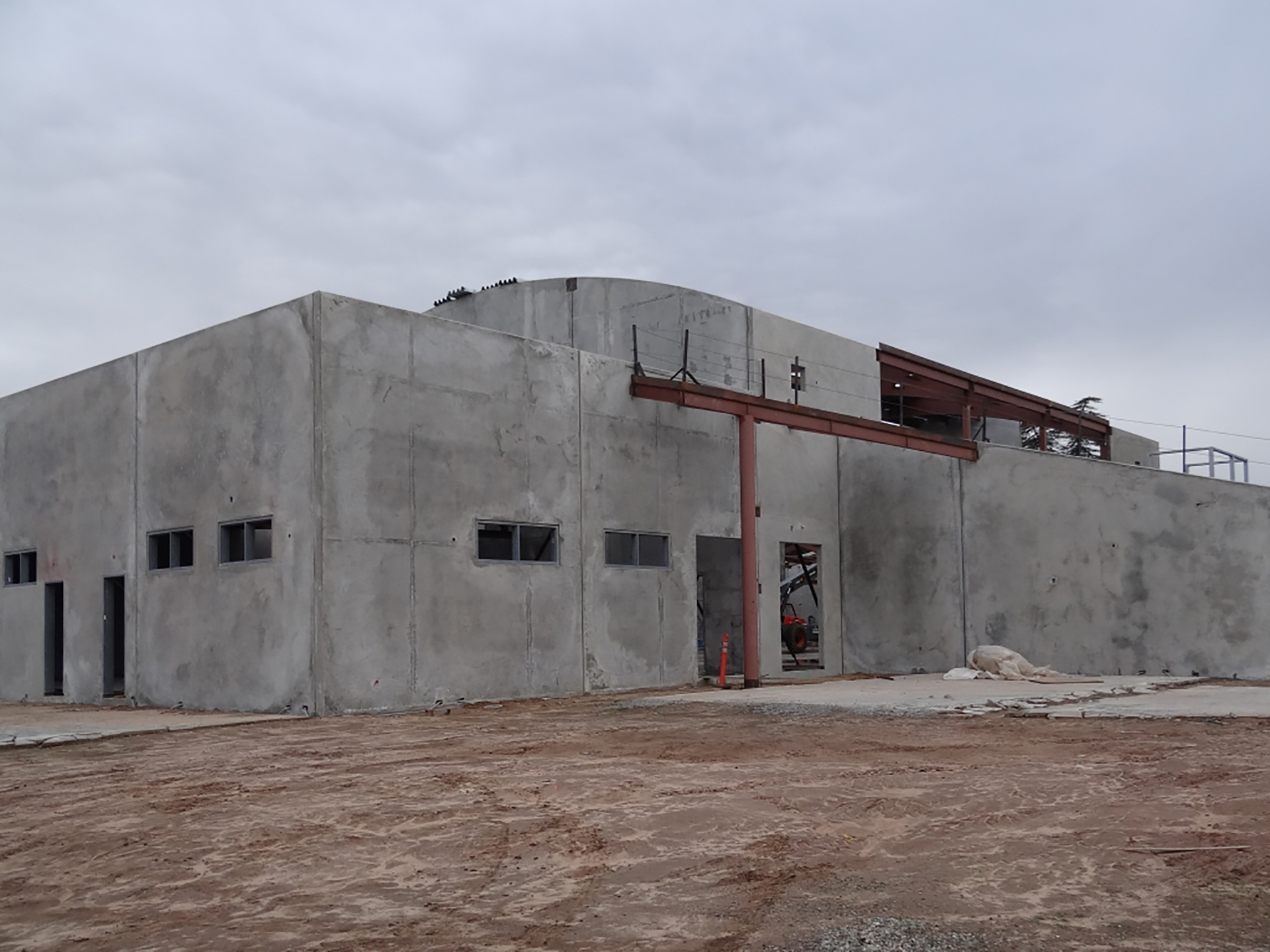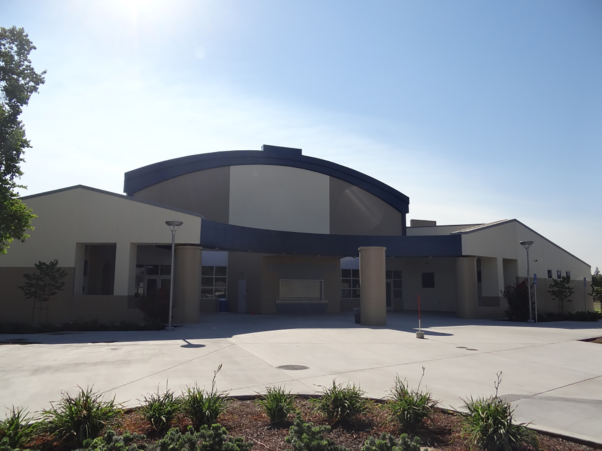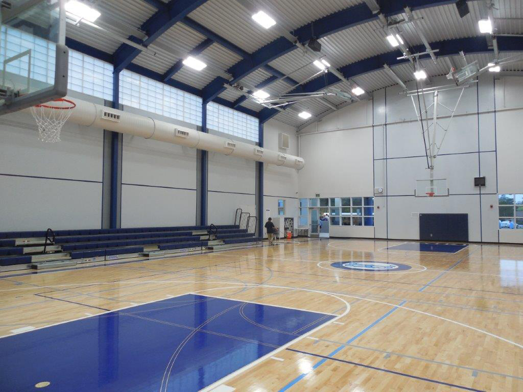 The new gymnasium is constructed with concrete tilt-up panels and structural steel framing. The building stands on a conventional concrete pad and continuous wall foundation system.