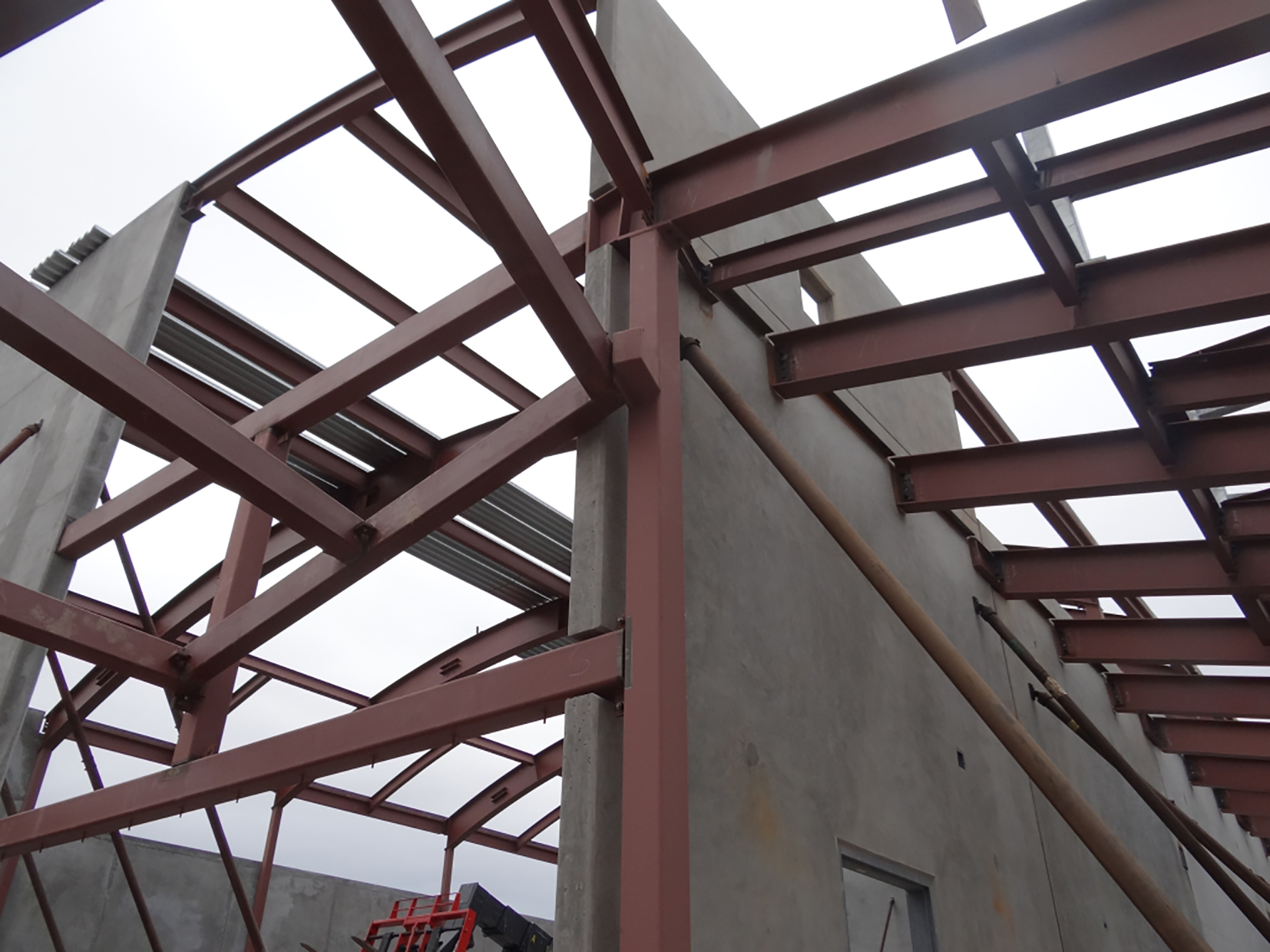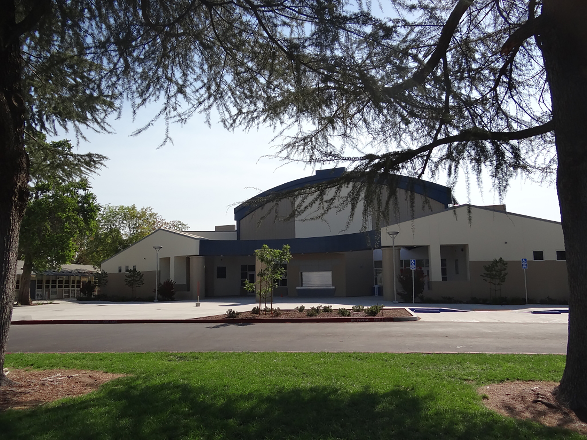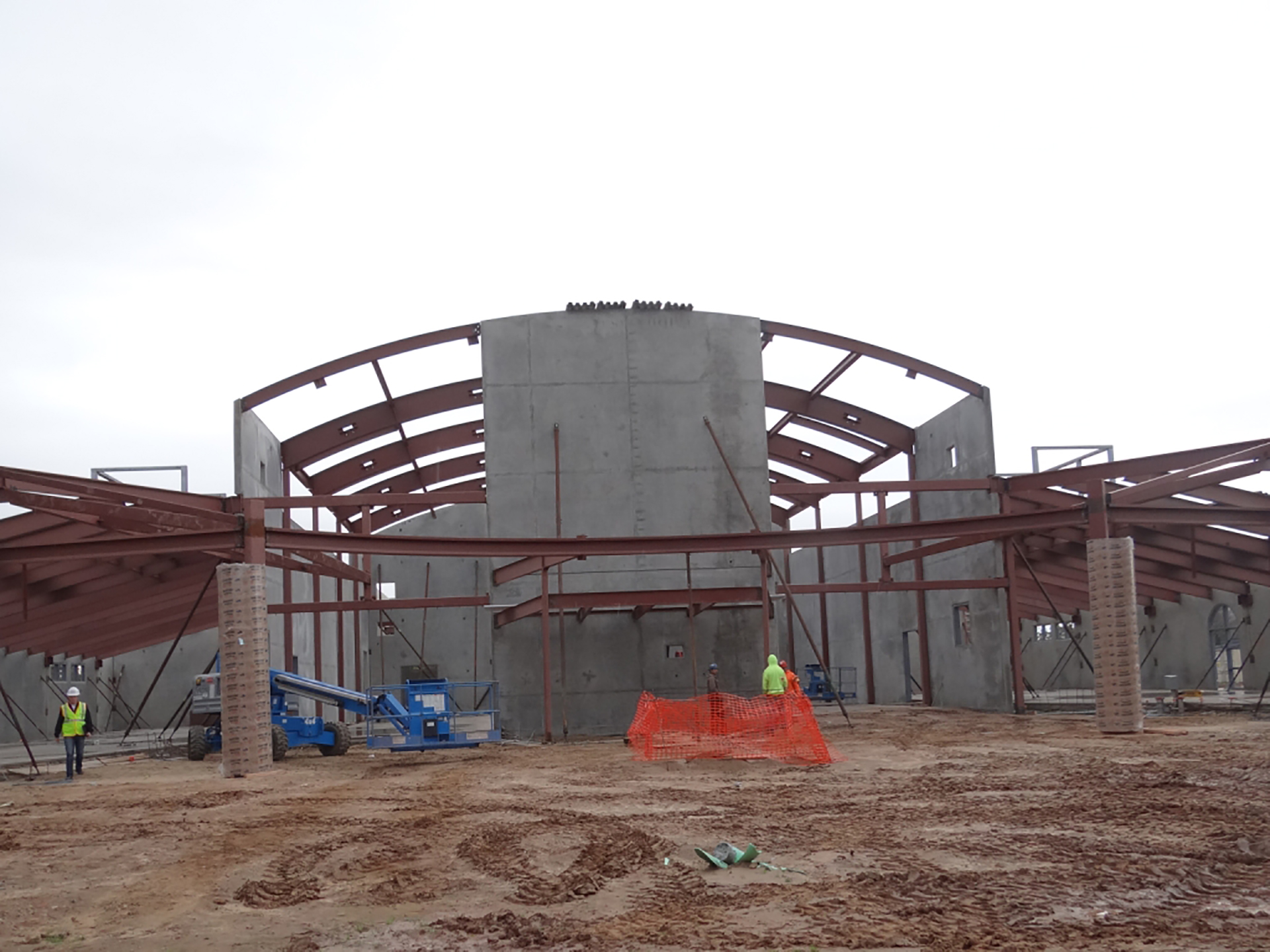 The new gymnasium is constructed with concrete tilt-up panels and structural steel framing. The building stands on a conventional concrete pad and continuous wall foundation system.
