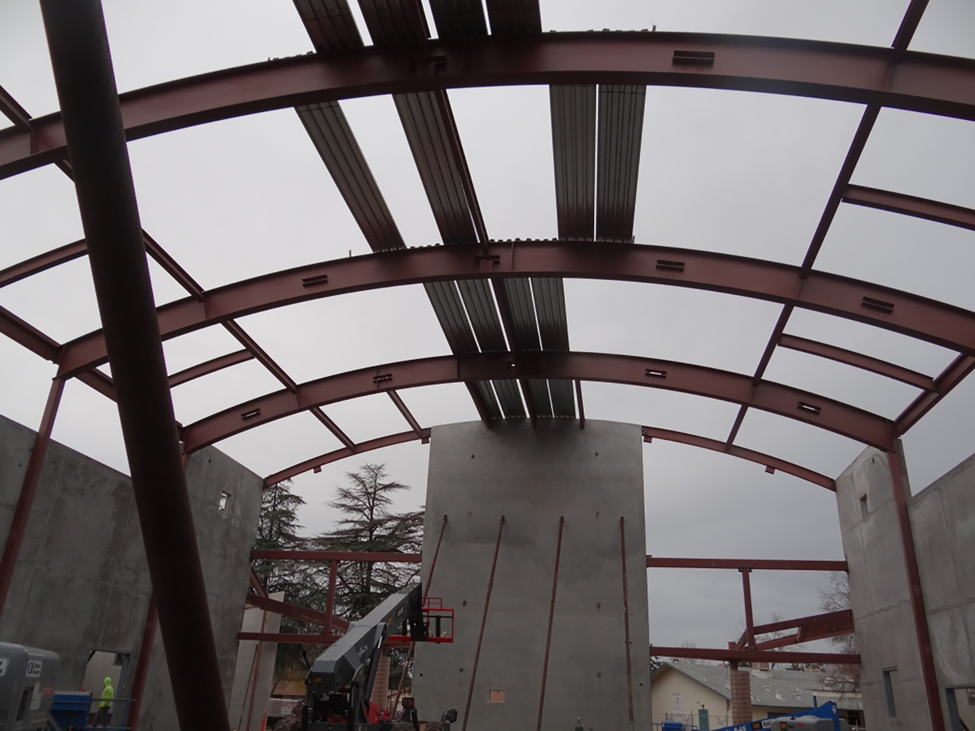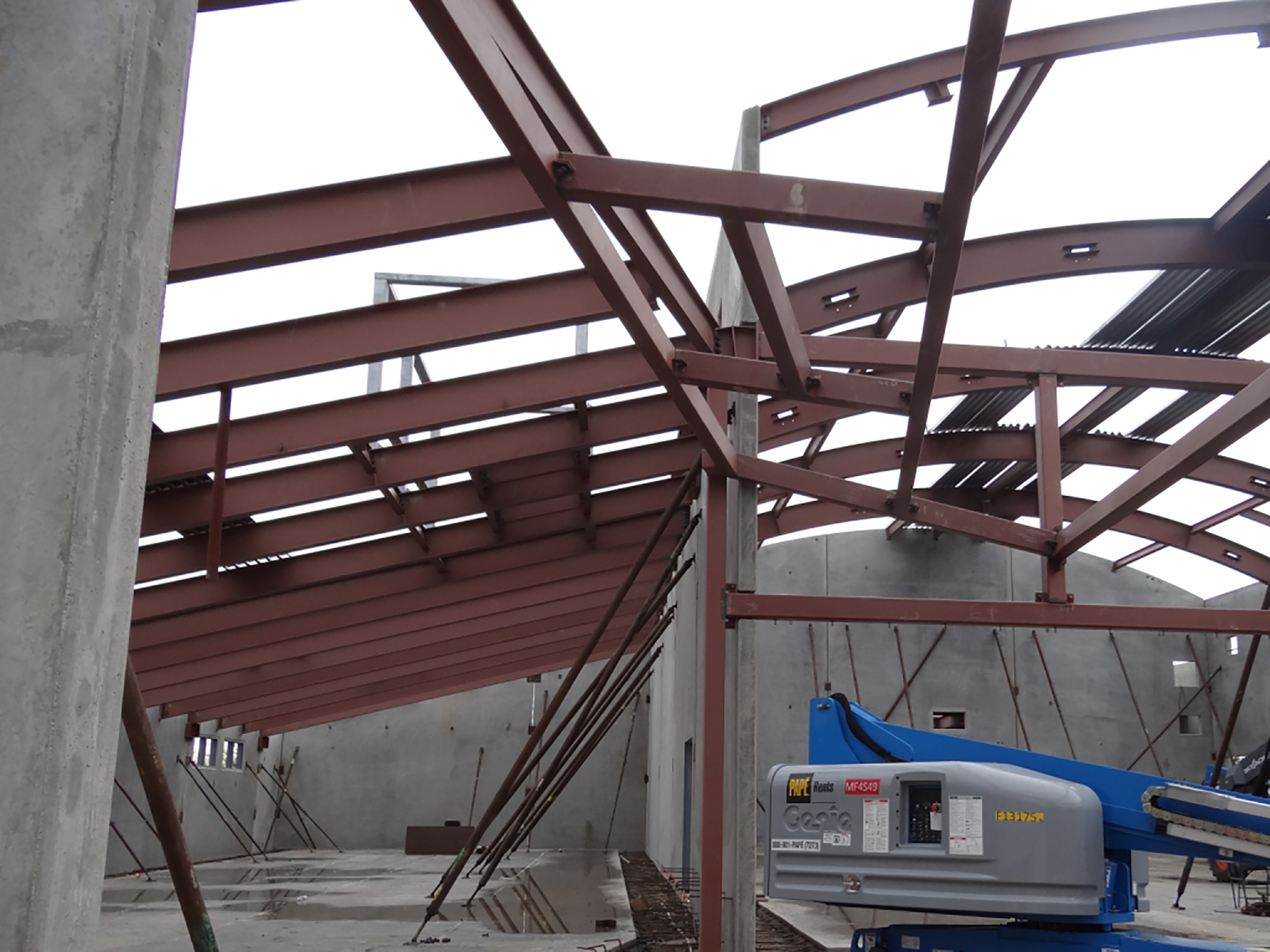 The gymnasium building includes locker rooms, class rooms, offices and a snack bar. The gym’s barrel is framed using beams spaced at an astonishing 20’ on center thank to a 16 gauge 3” deep deck.
