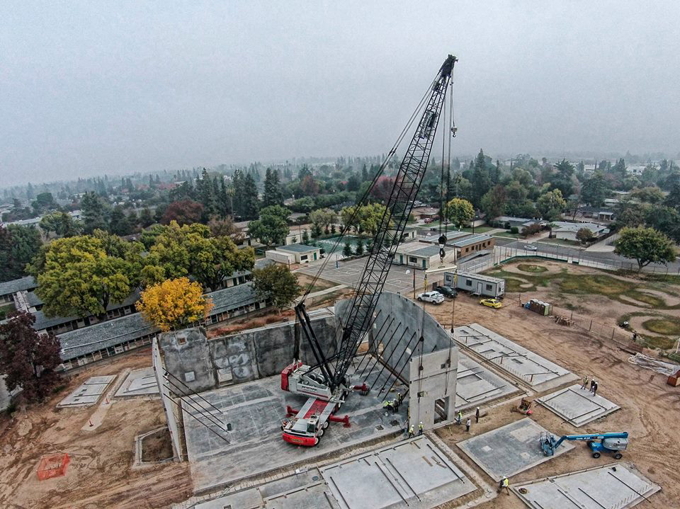 The concrete tilt-up wall panels were poured on site and lifted into place by a crane. The largest wall panel weights over 45 tons.