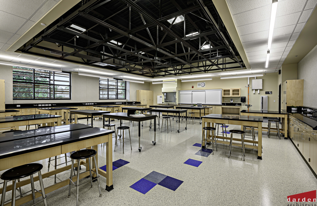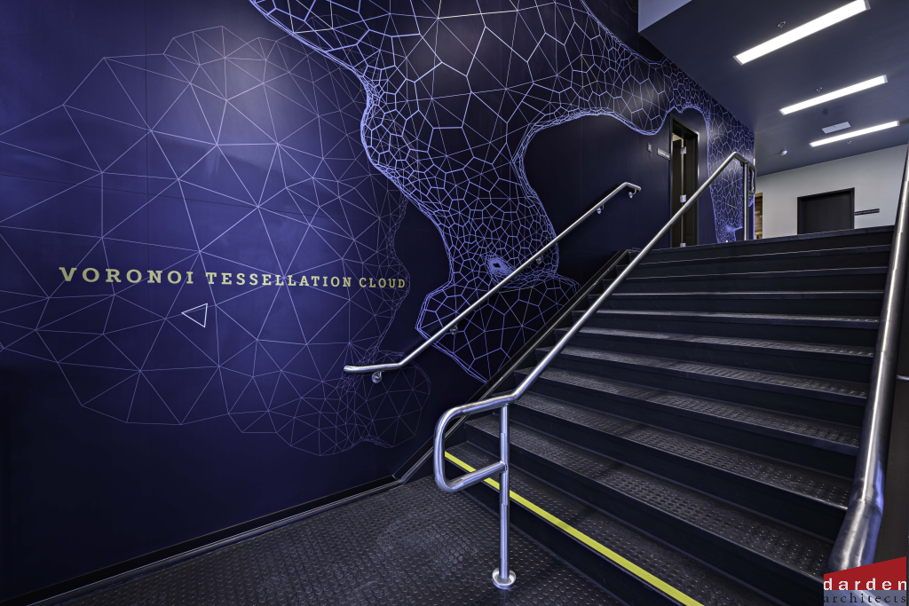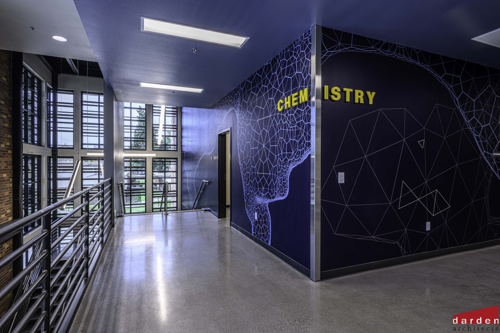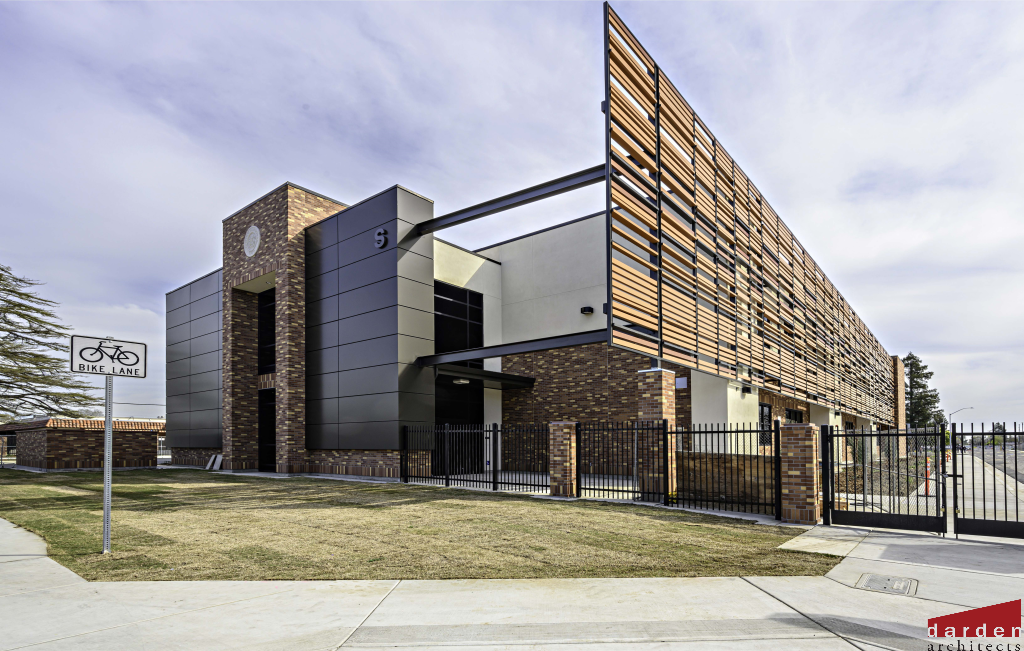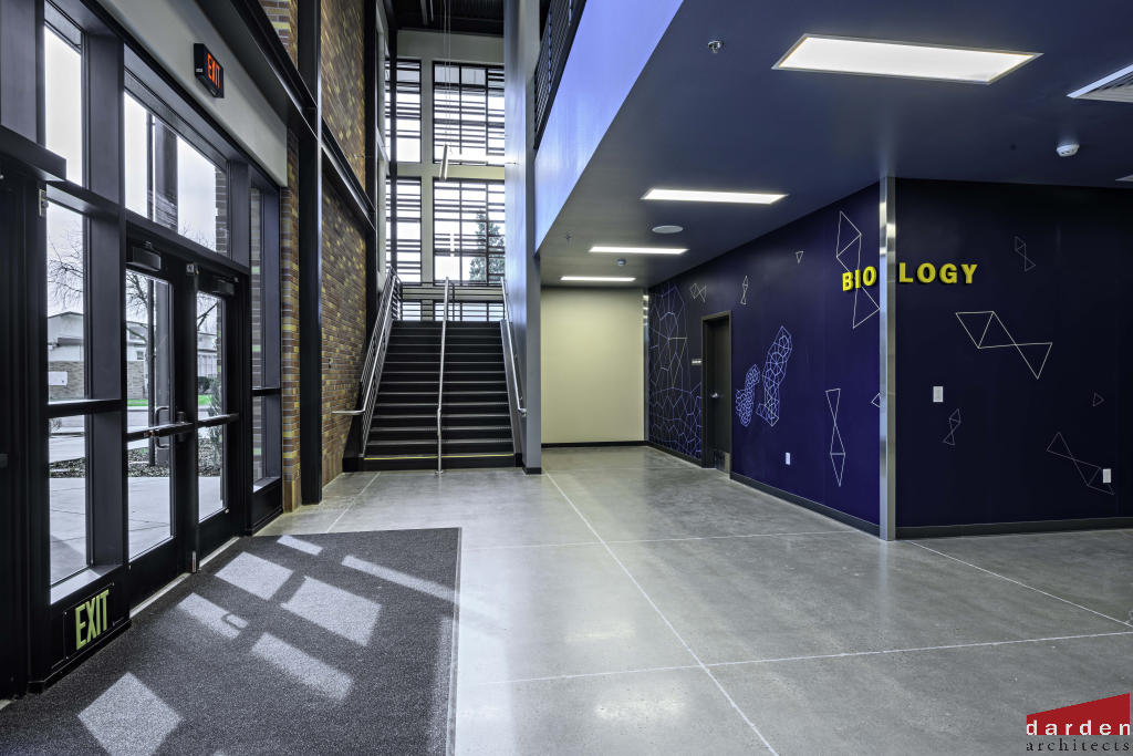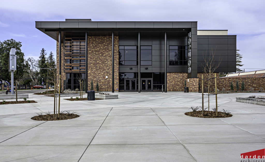 Hey Turlock, your DNA is showing! The west side of the building is protected from the sun with a 160’ long sunshade wall. The sunshade’s louvers are arranged to resemble a DNA sequencing ladder of a bulldog (the school mascot). The giant sunshade cantilevers off the building 5’ and extends 33’ above the ground.